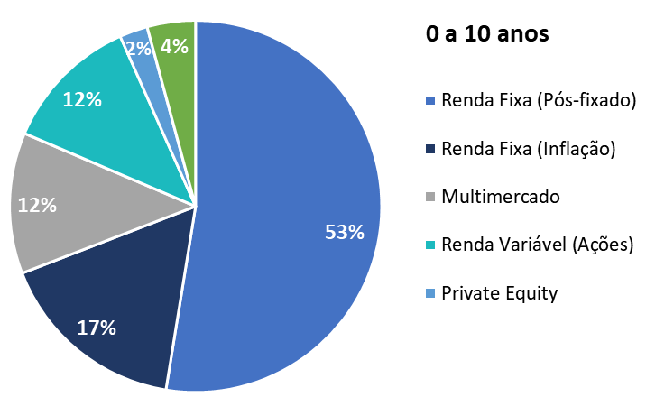 Os demais perfis de investimentos (0 a 10 anos, 10 a 20 anos ou 20 anos ou mais), além de ter em sua composição a estratégia citada no perfil Aposentado, são compostos também pela Renda Variável (ações), que como pôde ser acompanhado através dos noticiários, apresentou um dos piores resultados da história, como exemplo, o Ibovespa, principal indicador da bolsa de valores do Brasil, que encerrou o mês de março com rentabilidade negativa de -29,90%. Com isso, esses perfis, guardadas as proporções que cada um tem nessa classe, apresentaram resultados mais negativos que o perfil Aposentado. A seguir, gráficos com a composição total de cada perfil de investimentos.