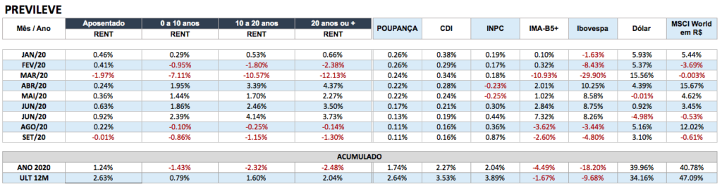 Os perfis de investimentos (0 a 10 anos, 10 a 20 anos ou 20 anos ou mais), também apresentaram resultado negativo no mês, em virtude da performance negativa apresentada pelos ativos de mais risco e que compõem a carteira dos respectivos, como exemplo: o índice de inflação longa (IMA-B 5+) encerrou o mês em -2,60%. Já o principal índice da bolsa brasileira (Ibovespa), fechou o mês com resultado negativo de 4,80%. Já o MSCI World em R$, índice de Renda Variável global, que representa as ações mundialmente, apresentou no mês resultado negativo de 0,61.